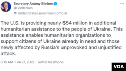 „Оваа помош им овозможува на хуманитарните организации да ги поддржат граѓаните на Украина кои веќе имаат потреба и оние кои се новопогодени од неиспровоцираниот и неоправдан напад на Русија“, напиша на Твитер државниот секретар на САД Ентони Блинкен.