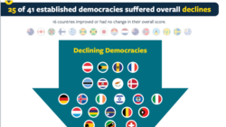 „Демократијата е во неволја. Оваа година регистриравме напад на правата на еднаквост и правата на ранливите групи и во демократиите и во бруталните режими. Сето тоа придонесе 14-та година по ред да има опаѓање на глобалната демократија“, изјави Сара Репучи, потпретседателка на Одделот за истражување и анализи при Фридом хаус.