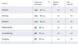 Северна Македонија останува „делумно слободна“ земја, но е подобро рангирана од лани во најновиот извештај на „Фридом Хаус“ со 63 поени, 4 повеќе во однос на 2019-та година. Државата има 24 од 40 можни поени во делот на политичките права и 39 од 60 во делот на граѓанските слободи.
