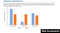 Генерално, извештајот констатира дека во целиот регион е забележан пад на демократијата, а како што е наведено, бројот на држави оценети како демократски не бил толку мал дури од 1995-та, кога првпат бил објавен ваков извештај – од вкупно 29 држави, тогаш 10 биле оценети како демократии, 10 како хибридни режими и 9 како авторитарни режими.